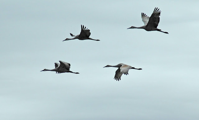 The photo of the crane landing below brings out some of their unique visual characteristics. The Sandhill Crane is evidently a very old species of bird which has not changed over time. The birds are probably one of the best examples of what a dinosaur might have looked like and their behavior is very charismatic at times. They do a very good job staying together as a group. The one crane that is landing flew out before with another small group but came back for the others before they all flew for the evening. The crane on the left was talking, the one in the middle looked like it was howling and the one landing looks like some kind of prehistoric dragon like bird. The Sandhill Crane is very entertaining to watch.